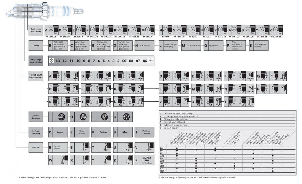 هر شرکت تولیدکننده، سیستم مشخصی برای نام‌گذاری محصولات خود دارد و معمولاً روی بدنه هر شمع، کد فنی آن حک شده است. این کد فنی اطلاعات مهمی درباره مشخصات شمع، مانند نوع، ابعاد و ویژگی‌های فنی آن در اختیار شما قرار می‌دهد. به‌عنوان نمونه، در تصویر زیر می‌توانید ساختار استاندارد کد فنی شمع‌های برند Bosch را مشاهده کنید.