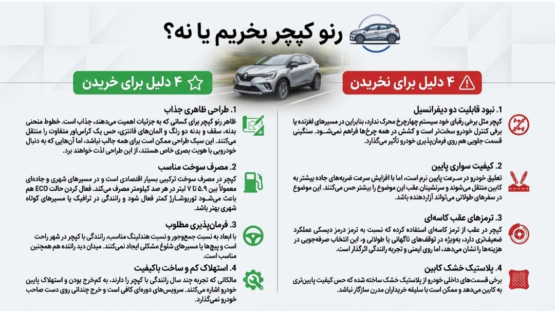 در پاسخ به رنو کپچر بخریم یا نه؟ لازم است بدانید که در کنار جذابیت بالا، قیمت معقولانه و البته دسترسی آسان به لوازم یدکی رنو کپچر، این خودرو معایبی هم دارد که به این شرح هستند: